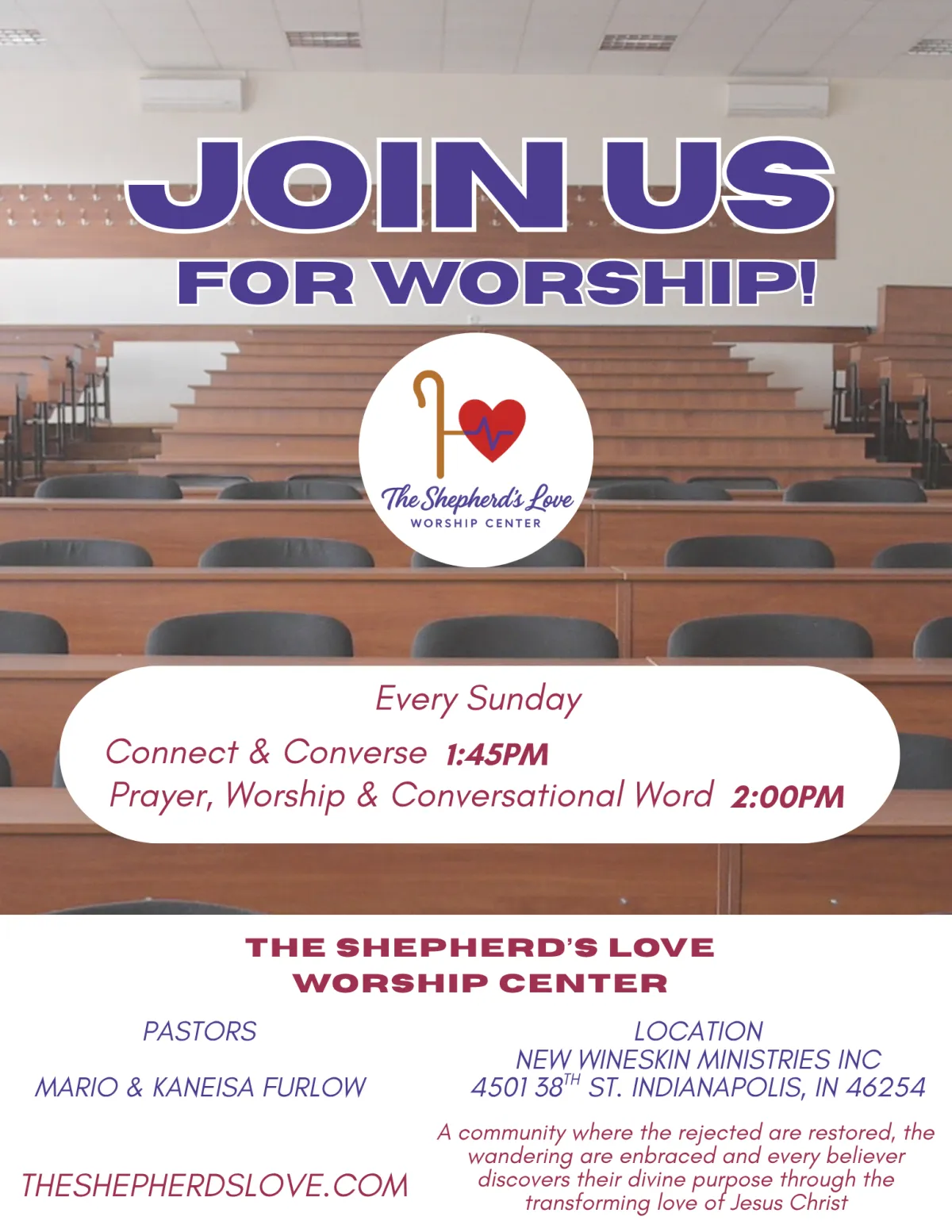 With hearts full of compassion and a vision for authentic community, Mario and Kaneisa Furlow lead The Shepherd's Love with humility and wisdom, creating a spiritual home where everyone can experience the transforming love of Jesus Christ.